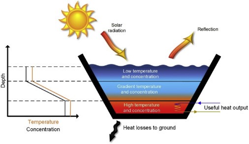 Solar ponds utilise water for collecting and storing the solar energy which is used for many applications such as space heating, industrial process heating and to generate electricity by driving a turbine powered by evaporating an organic fluid with a low boiling point.