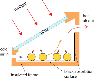 When placed in sunlight, the solar rays penetrate the glass covers and are ab­sorbed by the blackened surface thereby resulting in an increase in tempera­ture inside the box. Cooking pots blackened from outside are placed in the solar box.